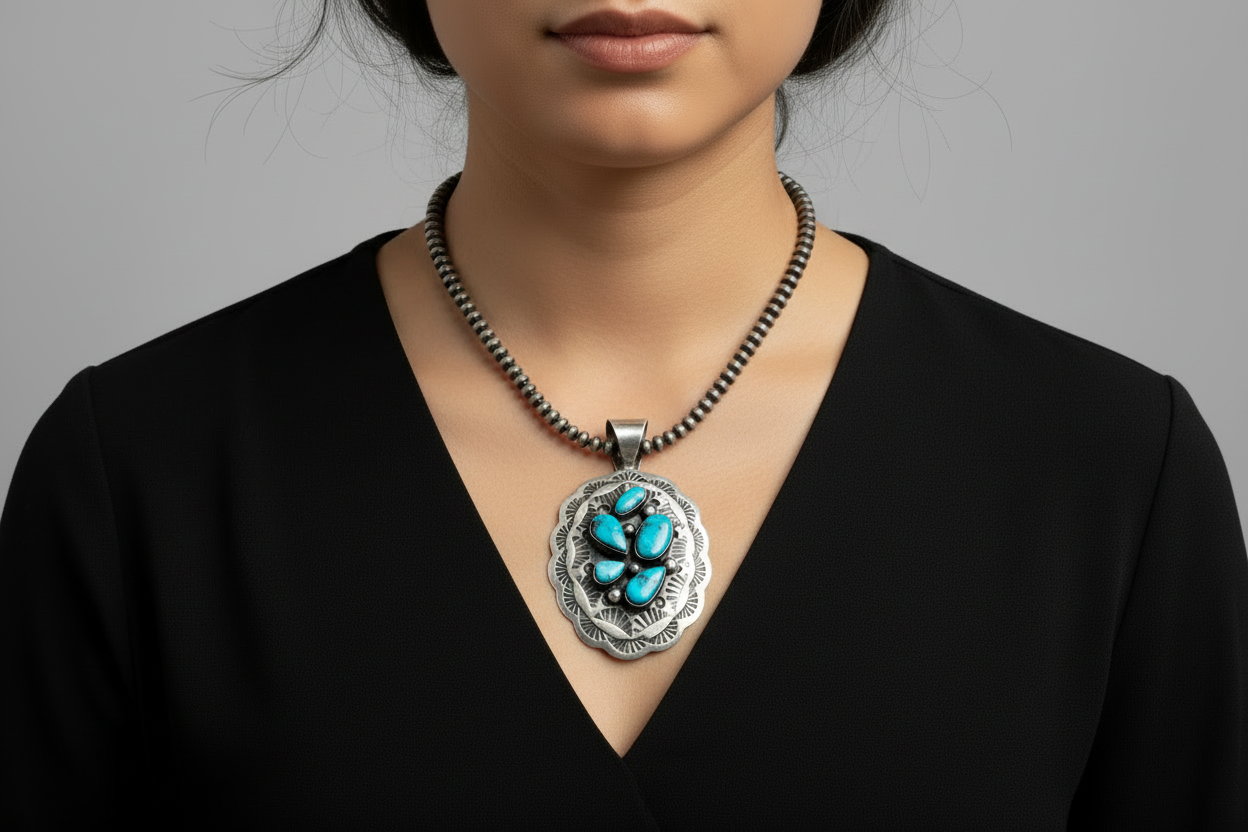 Inspired by classic Chimney Butte Navajo designs, this pendant evokes the spirit of the desert sky and the rich traditions of Native silversmithing. Its smooth bezel setting and fluid teardrop form give it a refined, earthy elegance that complements both everyday wear and special occasions.