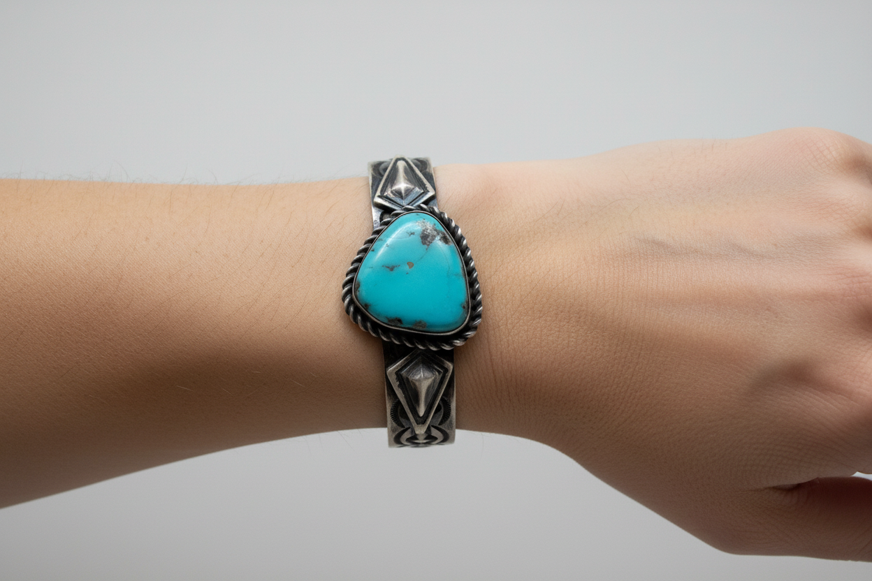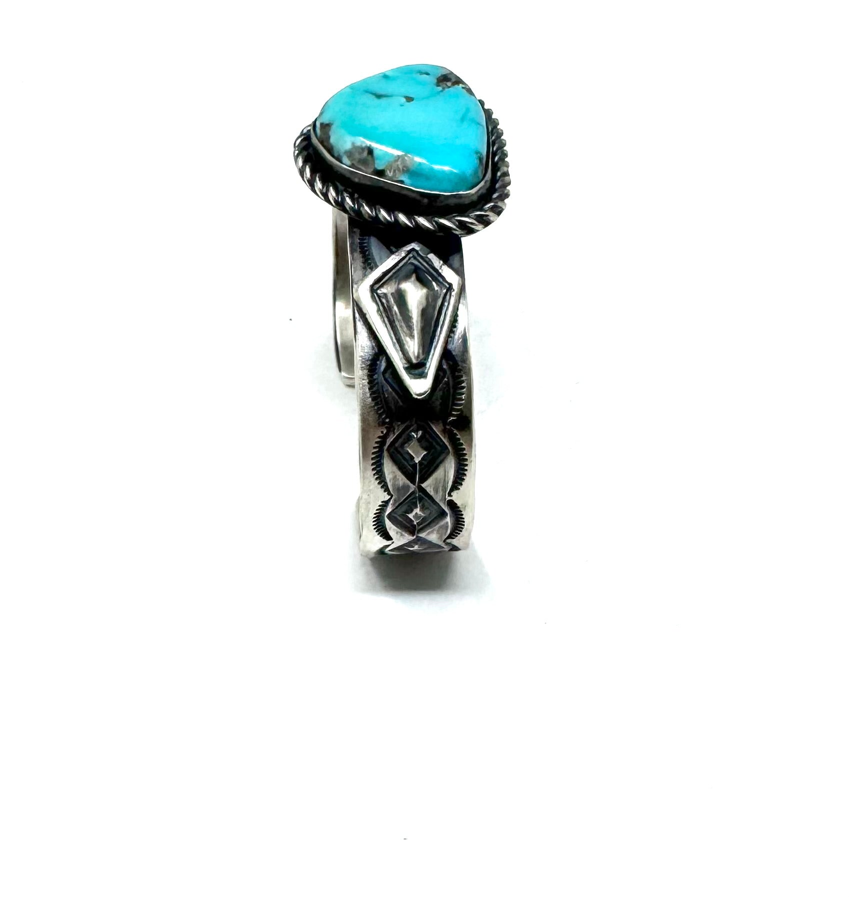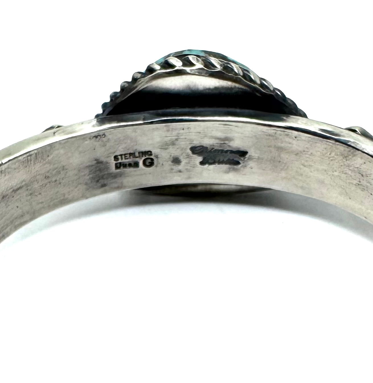 Honor tradition, craftsmanship, and bold Southwestern style with the Juan G Turquoise Rope Arrow Cuff. Hand-crafted by renowned artisan Juan G, this striking cuff combines rugged sterling silver work with a powerful turquoise centerpiece—each stone chosen for its rich color, natural character, and grounding energy.