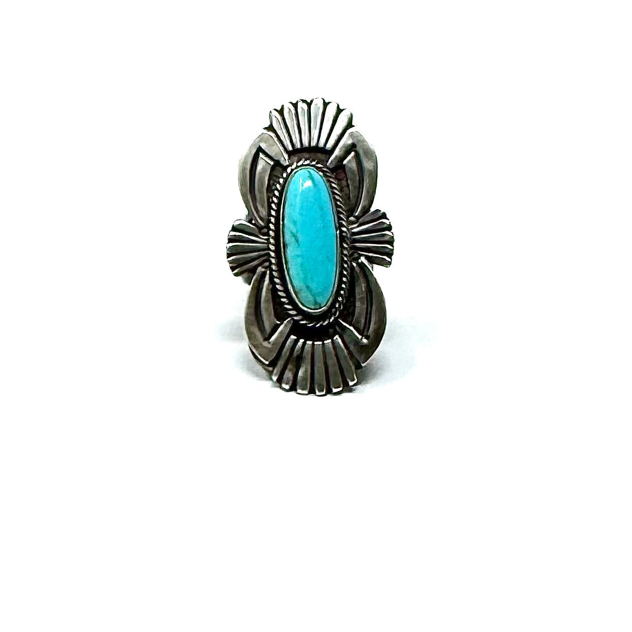 The smooth silver bezel setting highlights the stone’s brilliance, while the wide band offers both durability and comfort. Whether you’re elevating everyday outfits or adding a centerpiece to evening attire, this turquoise ring is designed to captivate and complement.