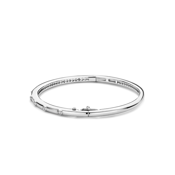 Elegantly twisted designs in sterling silver typify this chic bangle from the collection. The three strand bracelet, an in-house design for the modern lady, features one bangle in highly polished, smooth silver. The second is formed as a twisted rope, while the third offers a bubble effect. Each element of this piece is hard plated in rhodium - this offers protection against natural discoltheation and scratching and also gives an additional mirror shine. The cut-out structure on the inside offers lightness and comfort to the wearer. The oval shaping secures a close fit, while the hinges and lock are concealed within the design.