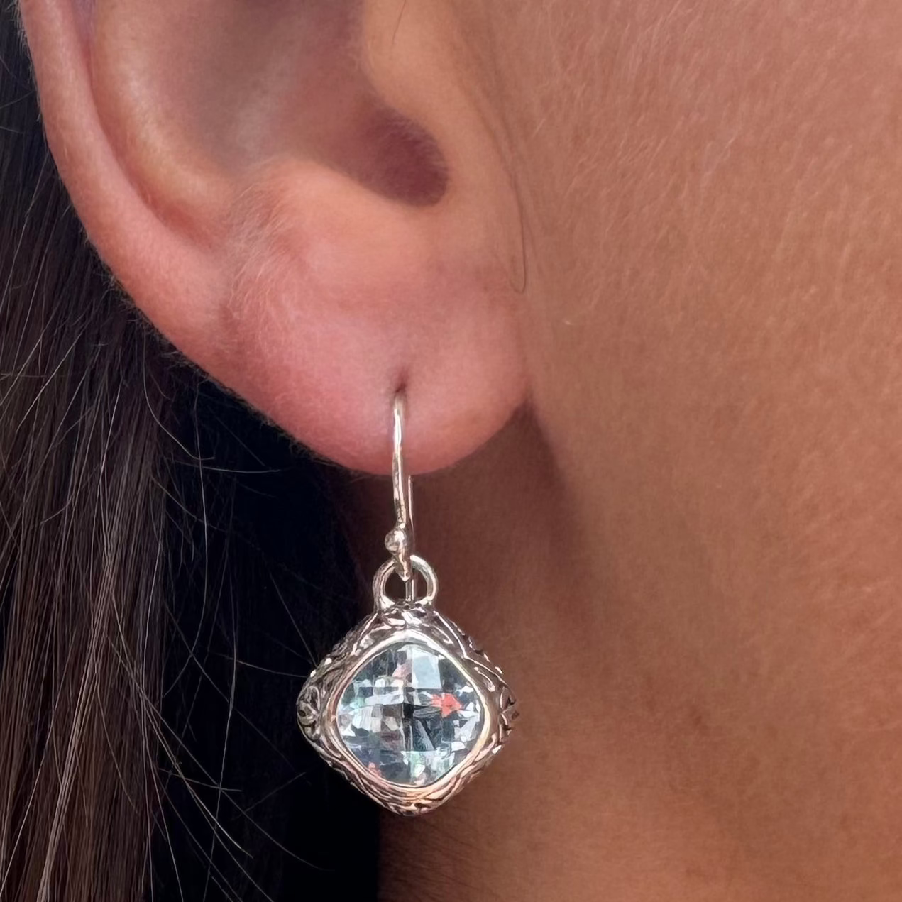 These sterling silver dangle earrings are diamond shaped and set with beautiful blue topaz stones. The stones are surrounded by an intricate filigree design which adds a touch of glamour.