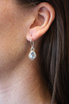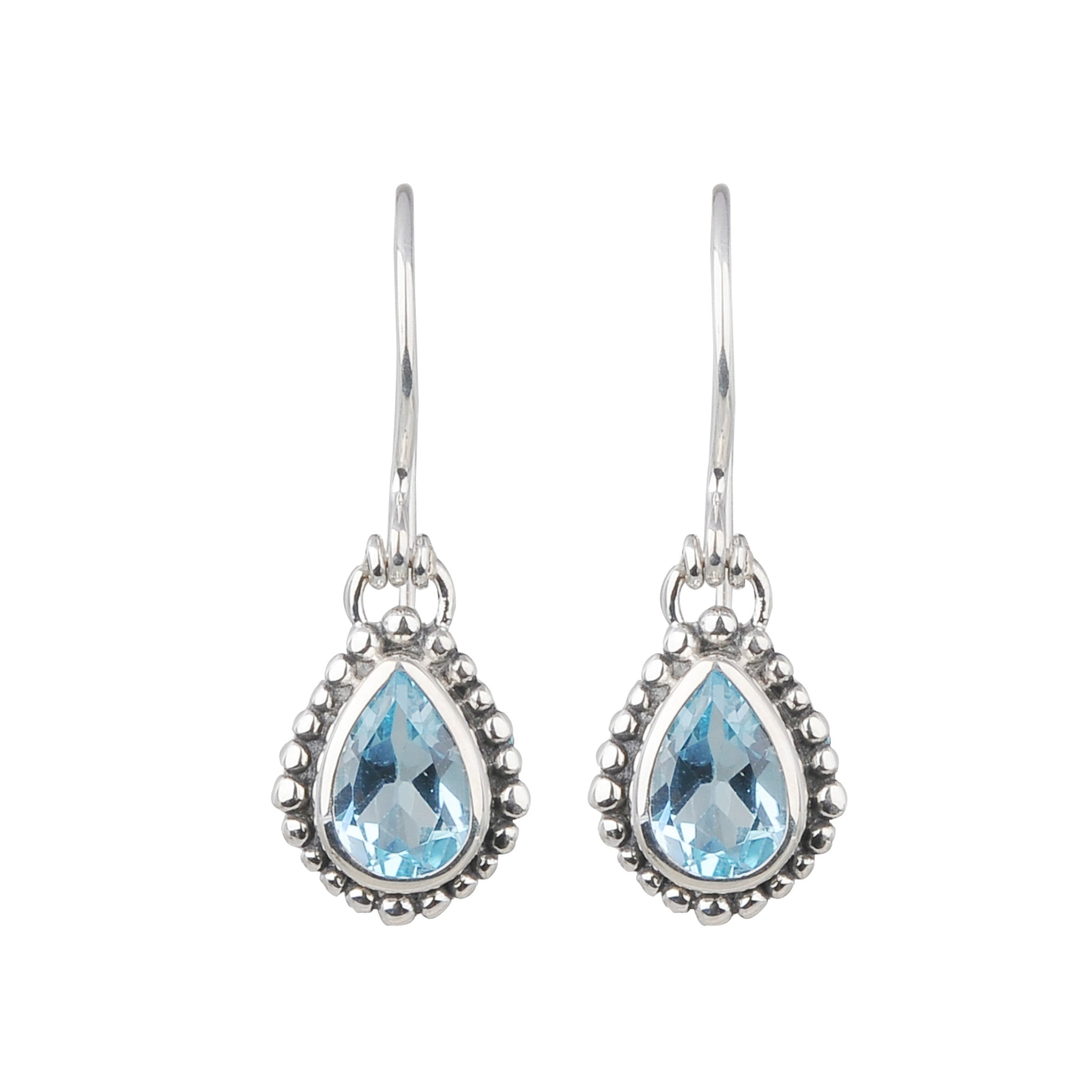 Beautiful blue topaz stones set in the shape of a tear drop and outlined with sterling silver beads make up a fun summer dangle.