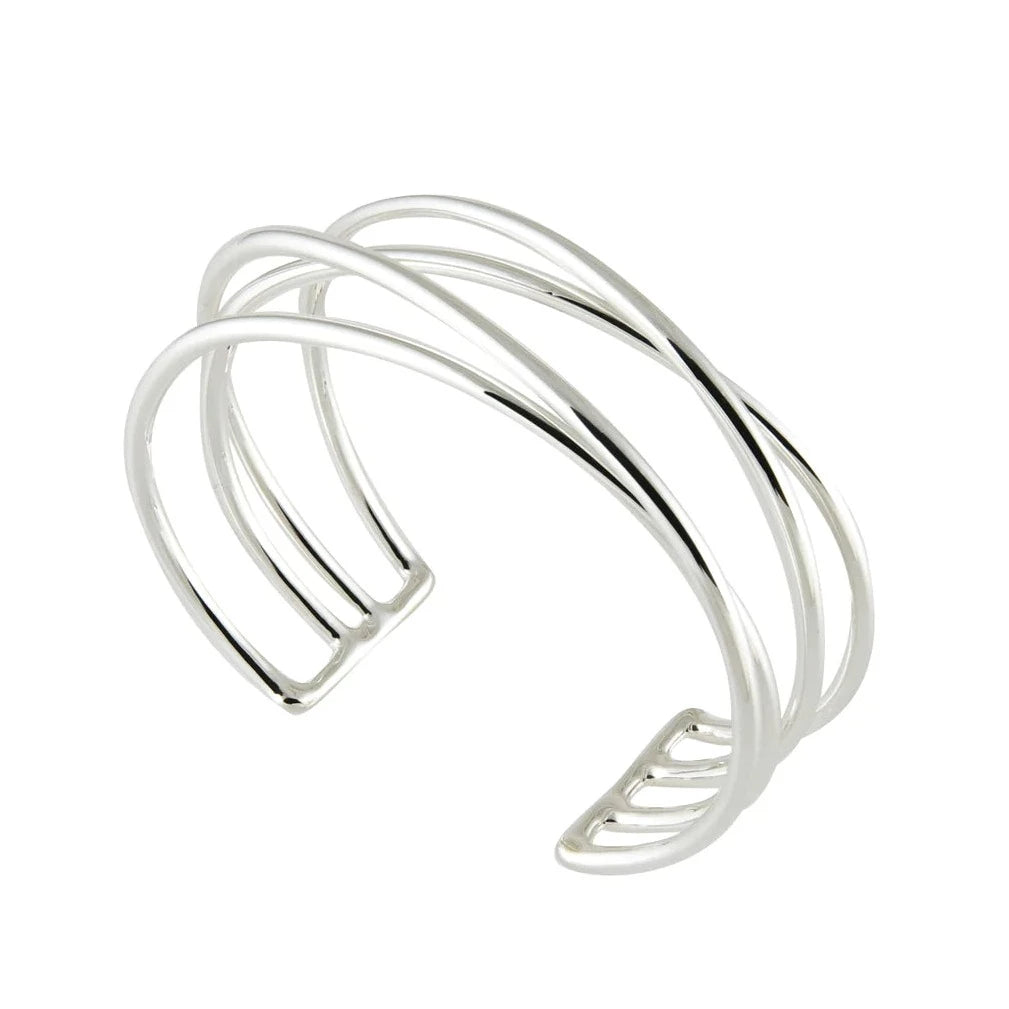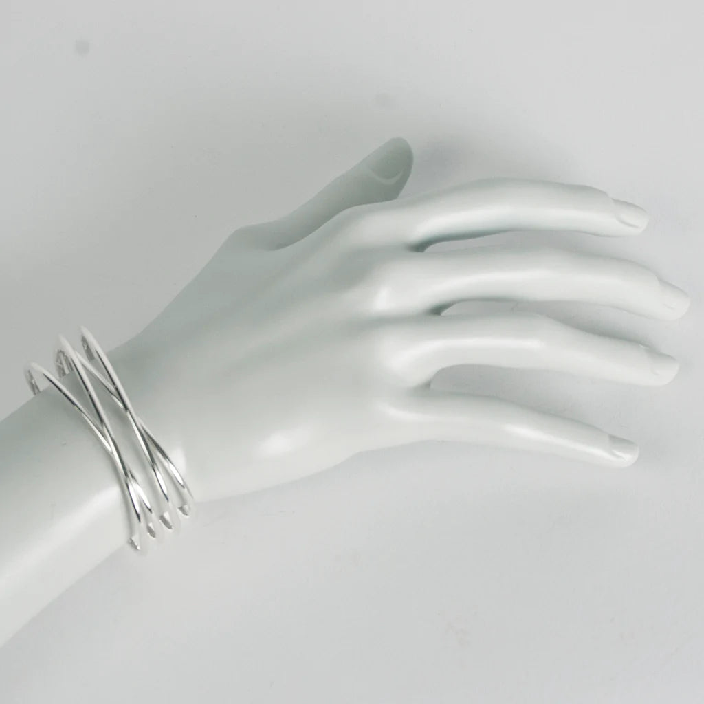 2mm Sterling Silver wires crisscross your wrist and intertwine with each other to make this stunning cuff bracelet.