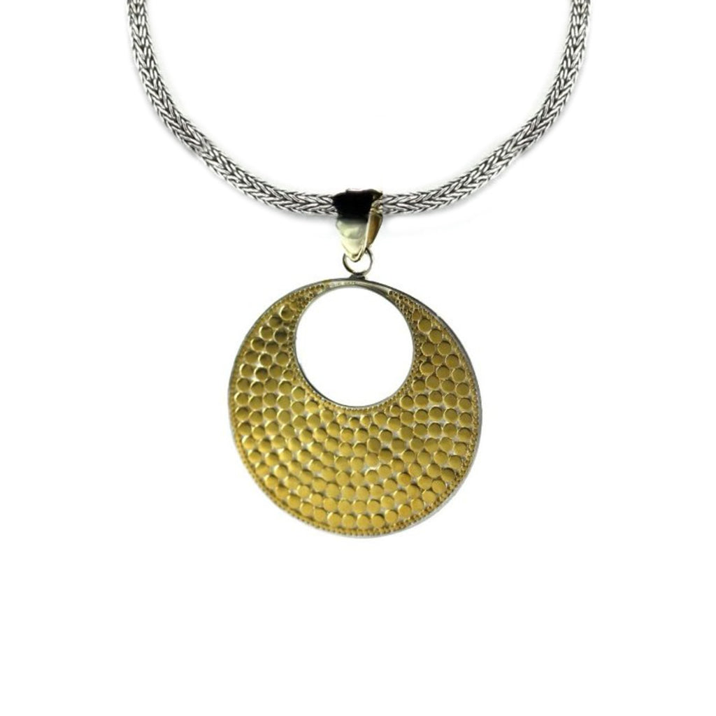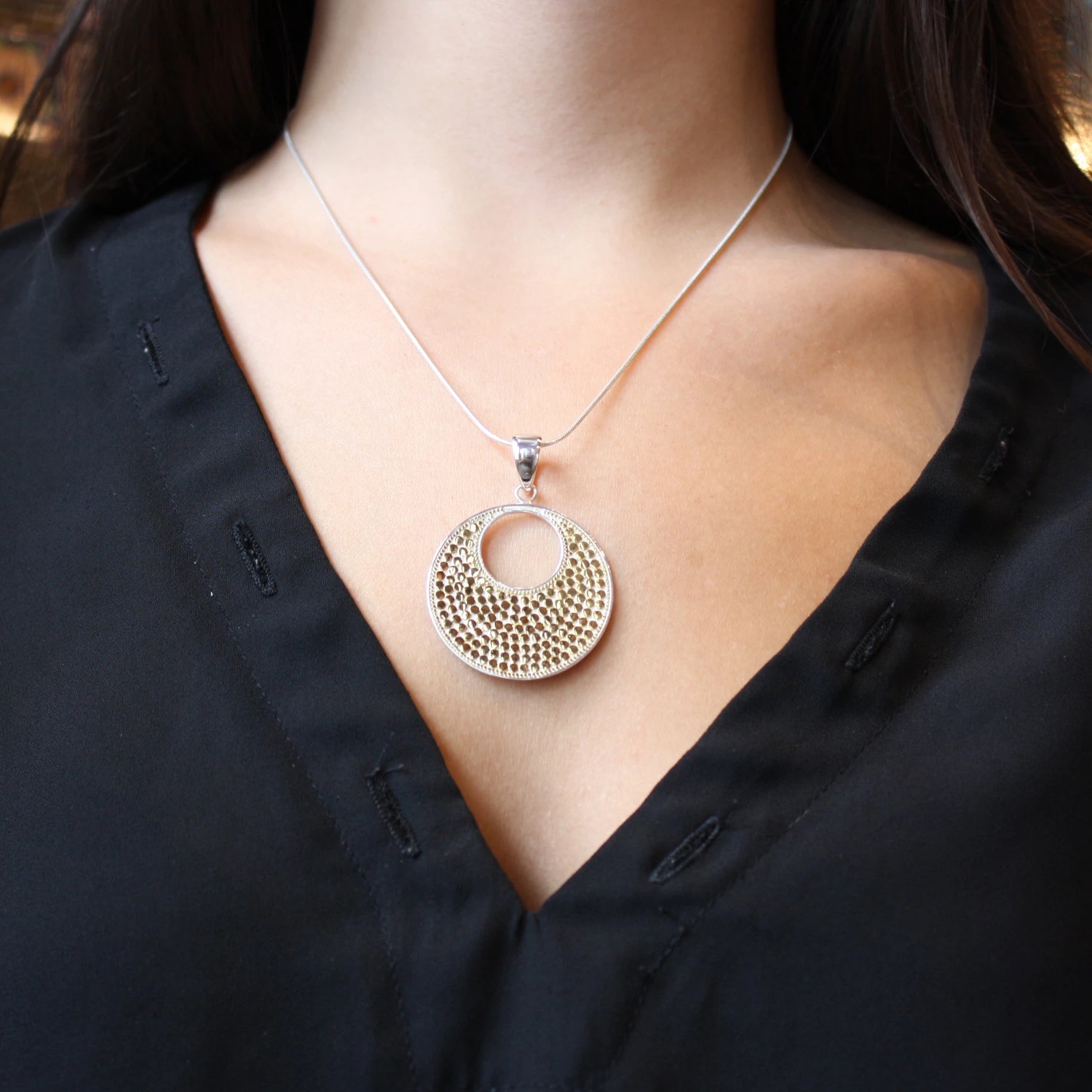 This sterling silver and 18k gold plate handmade graduated open circle pendant is covered in the traditional Balinese dotted pattern. A piece that will go with everything! From Bali, Indonesia.
