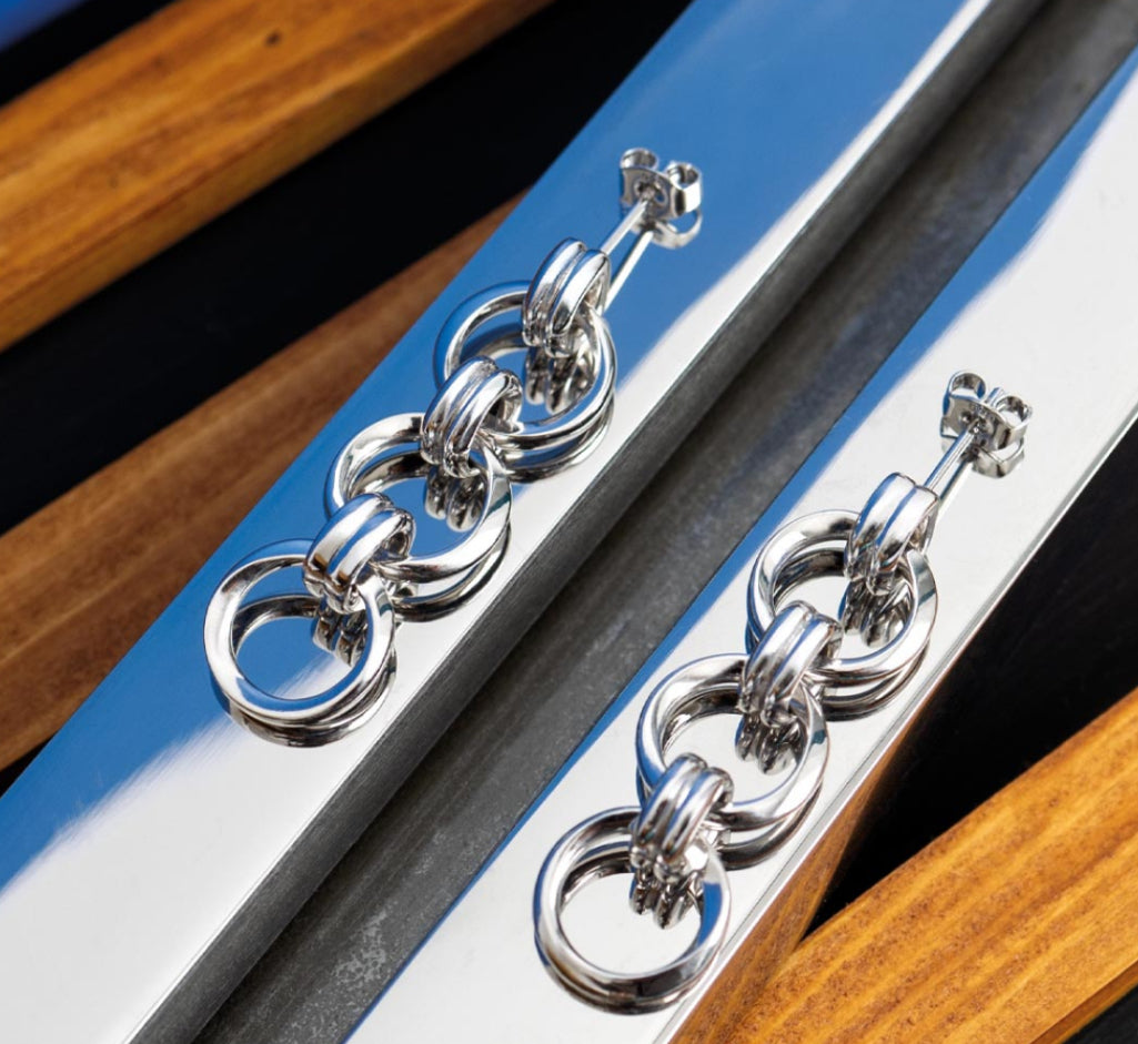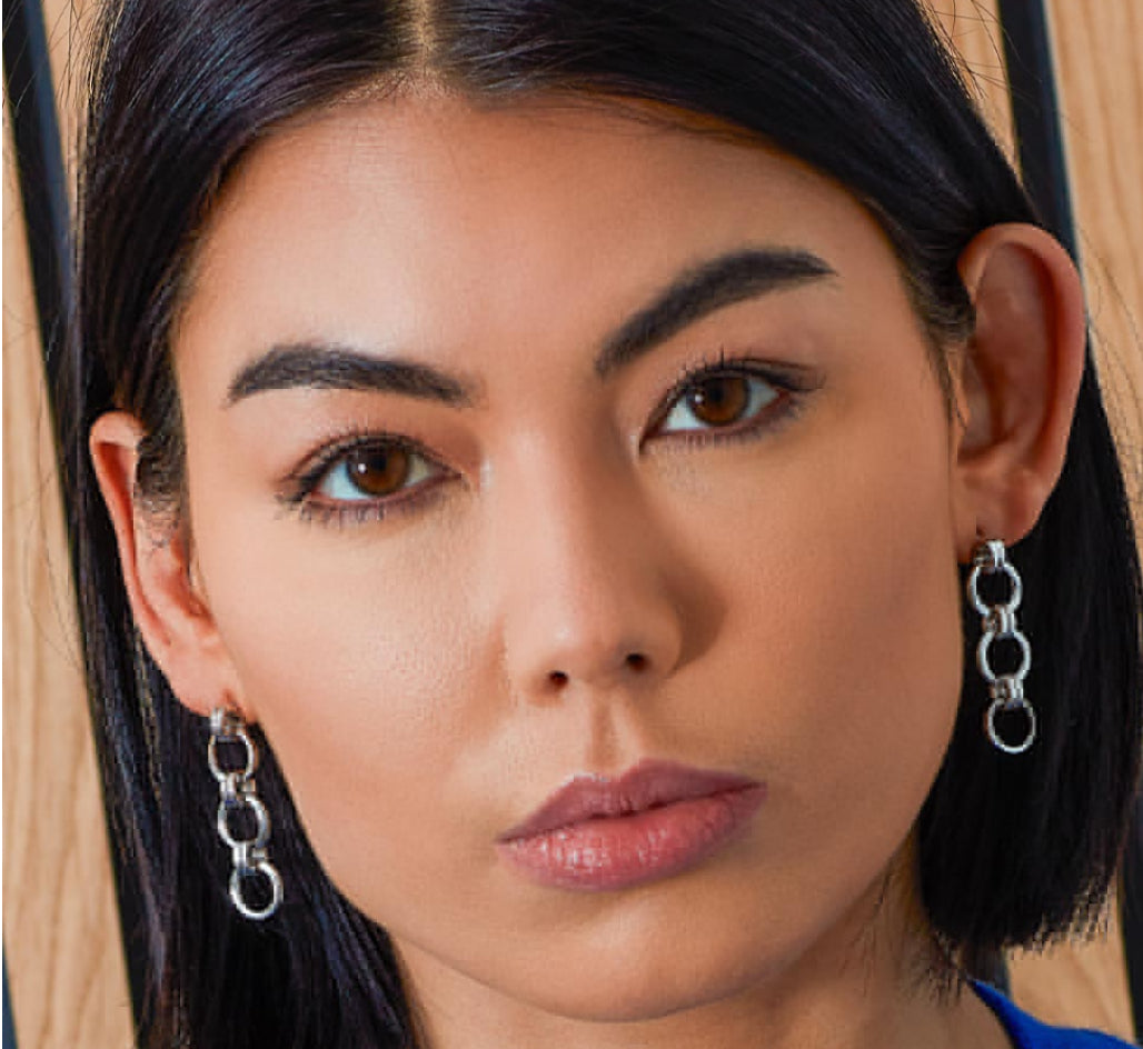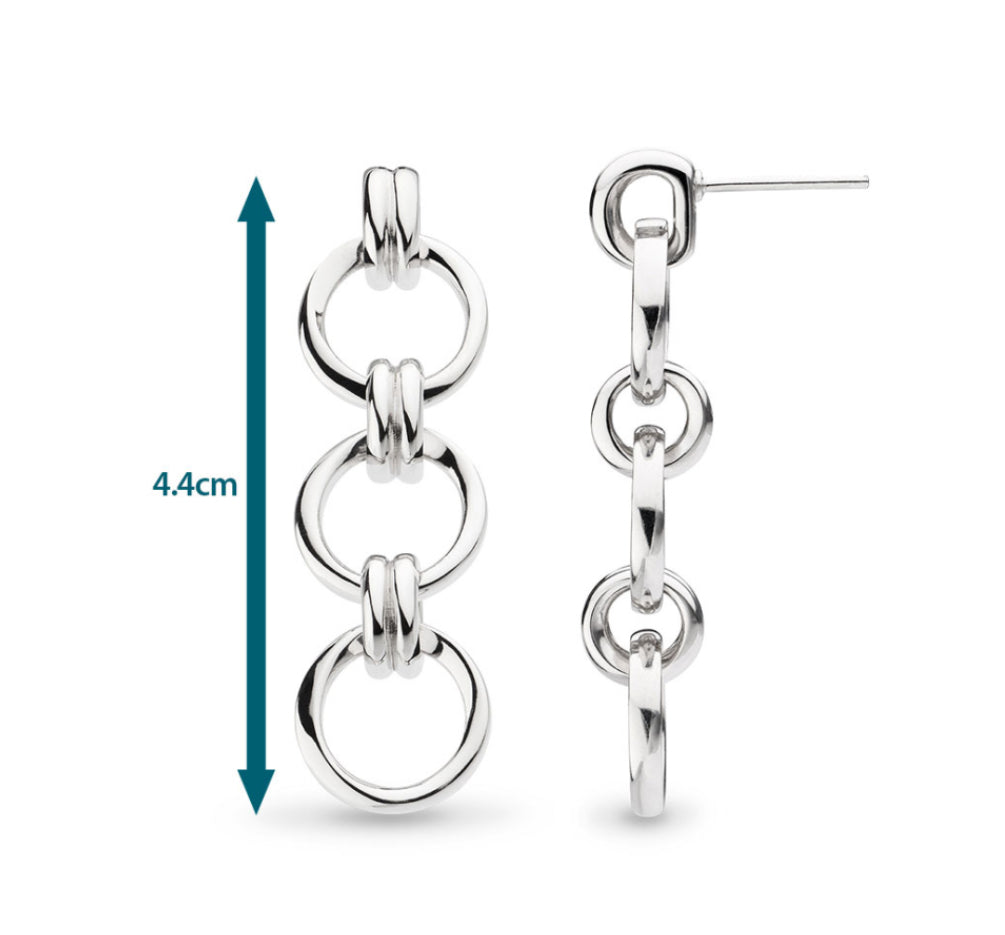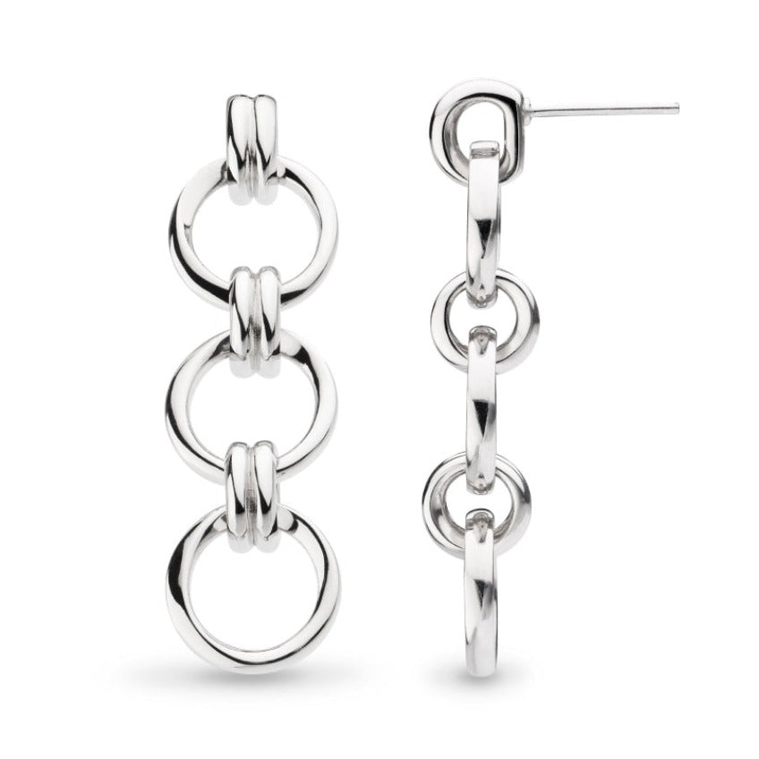 Eye-catching in sterling silver, our striking Bevel Unity Trio stud drop earrings feature three interconnected and movable circles bonded by smaller links. These earrings are thoughtfully designed to symbolize the essence of strength and connection. With a butterfly back and versatile for both day and evening wear, these timeless earrings make a bold retro statement.
