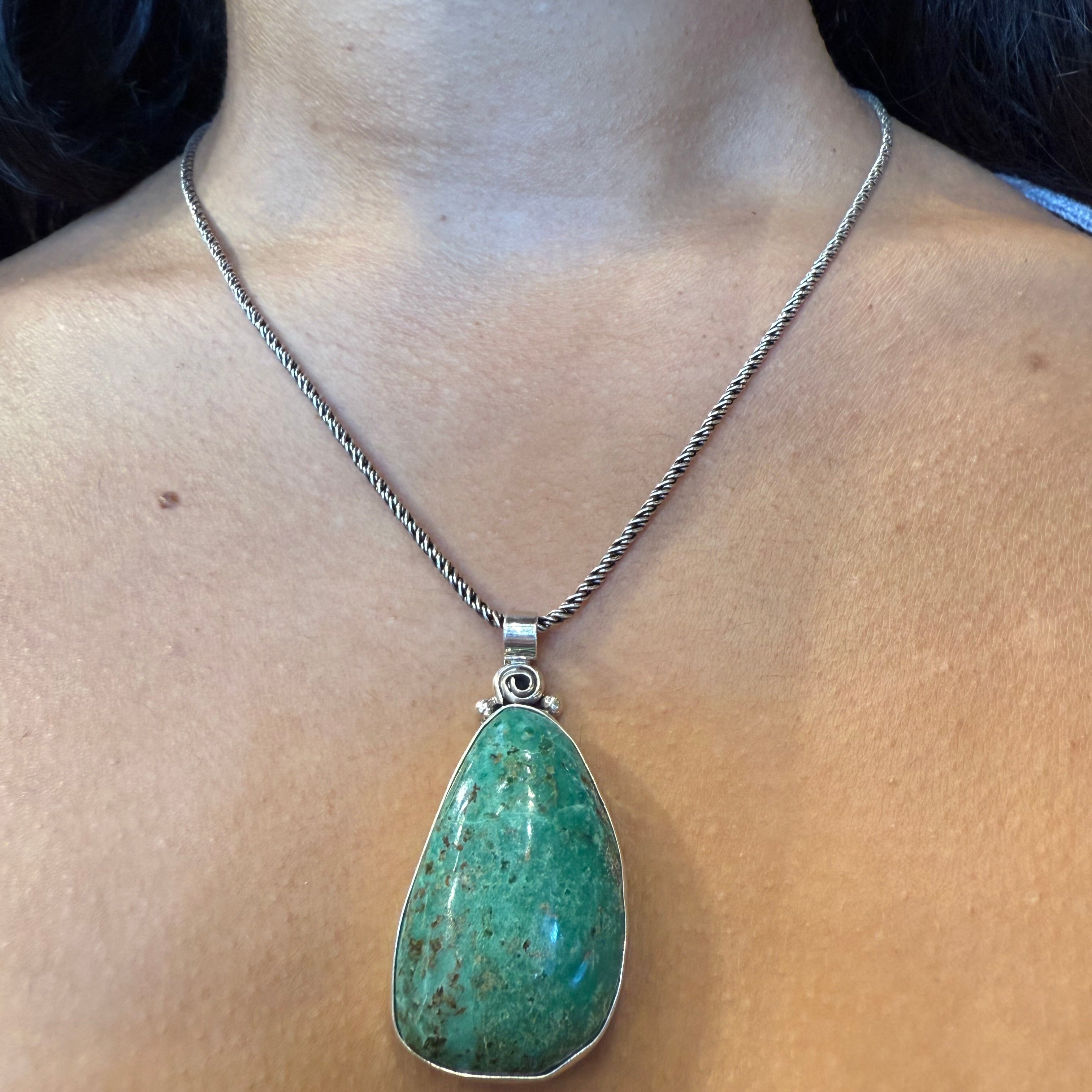 Whether paired with casual linen or evening attire, this turquoise pendant adds a touch of effortless elegance and authentic soul to any look.