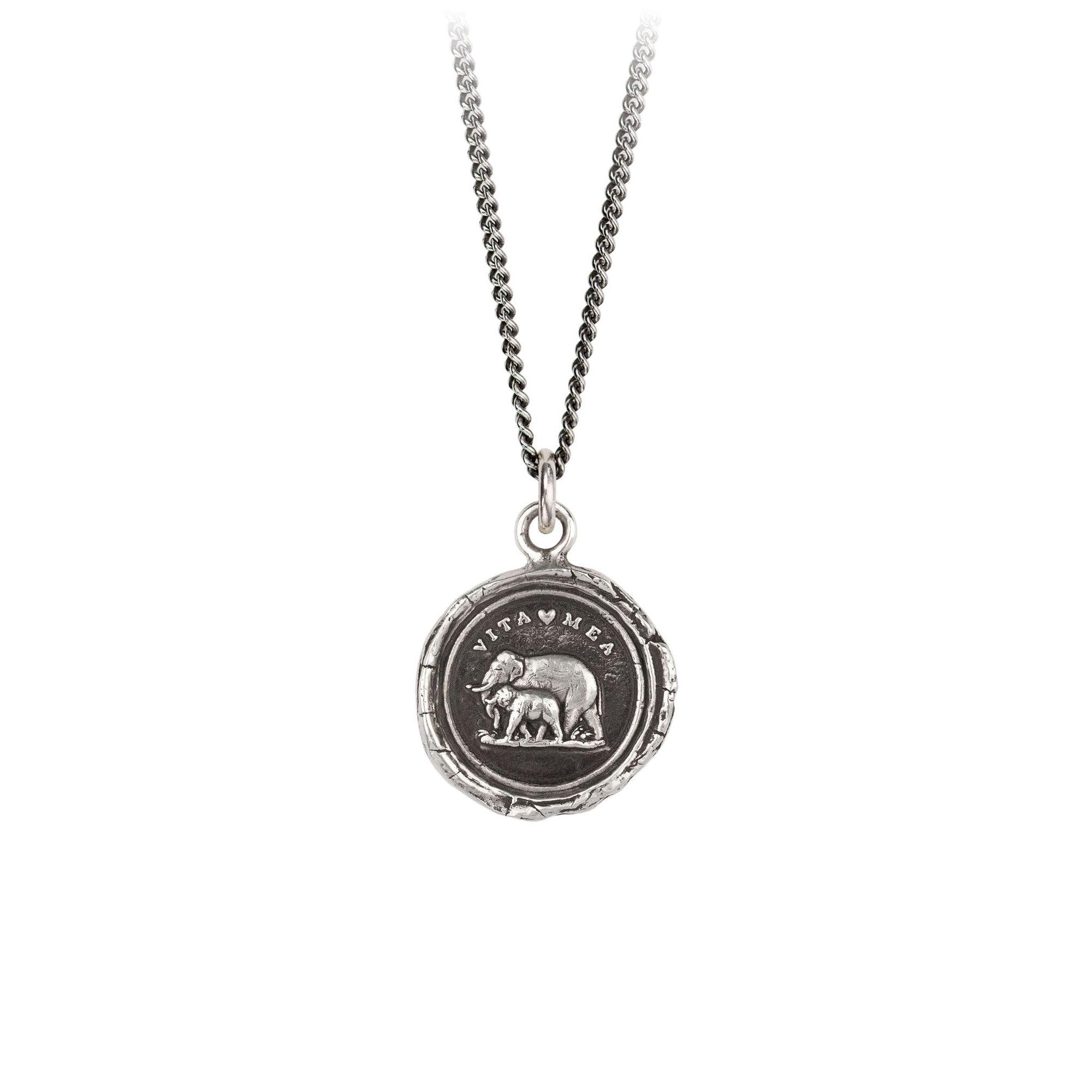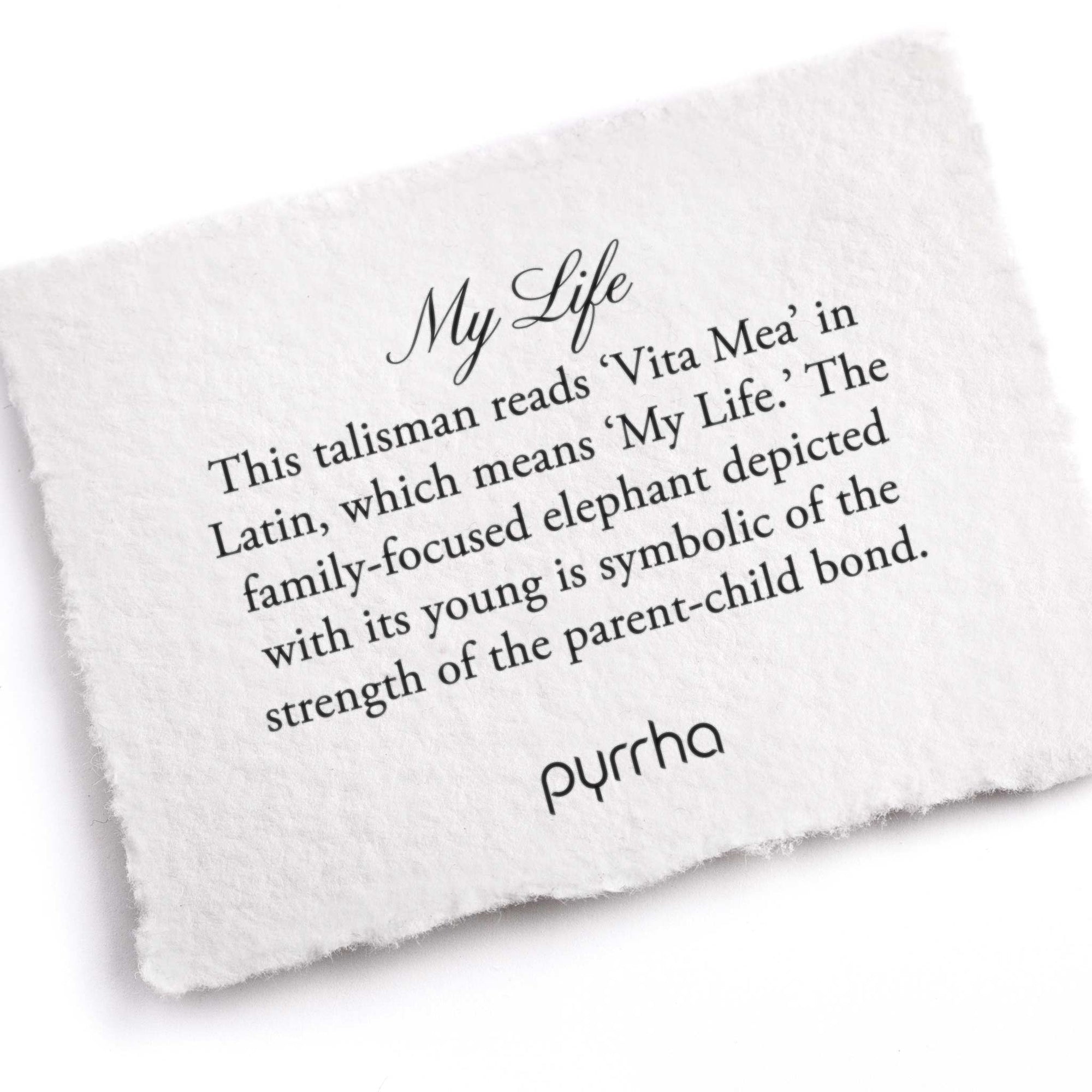 This talisman reads 'Vita Mea' in Latin, which means 'My Life.' The family-focused elephant depicted with its young is symbolic of the strength of the parent-child bond.