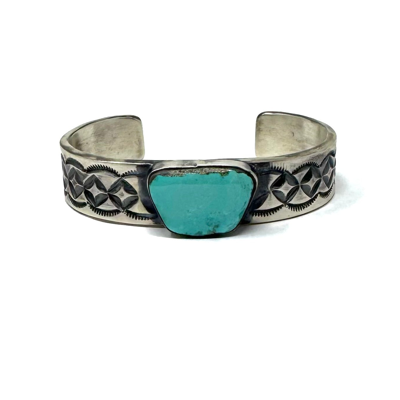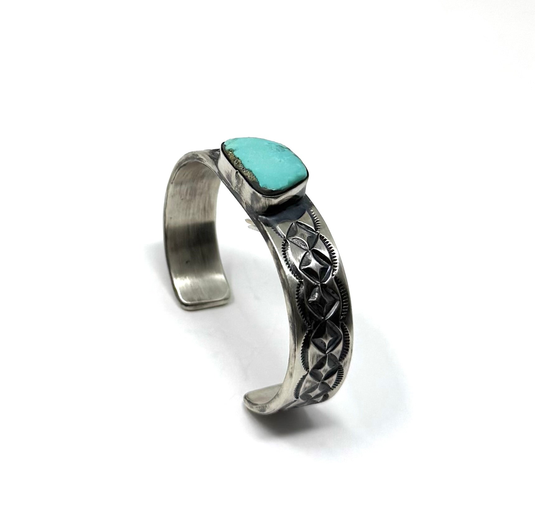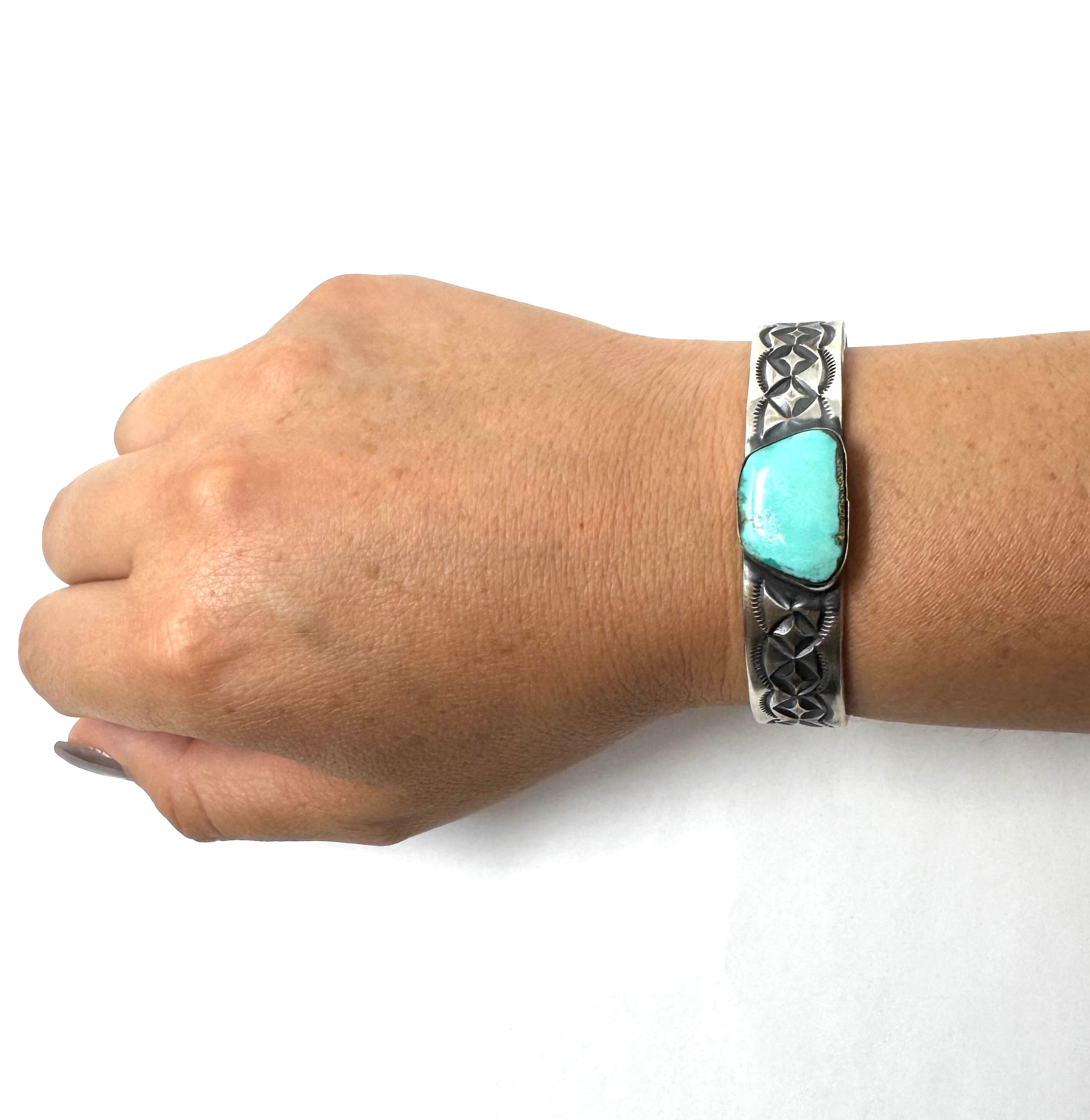 Set in a smooth, sturdy sterling silver bezel and mounted on a hand-forged cuff, this design celebrates the raw beauty of turquoise in its most natural form. Its clean lines and bold presence make it the perfect statement piece to elevate everyday style or complement a Southwestern-inspired look.