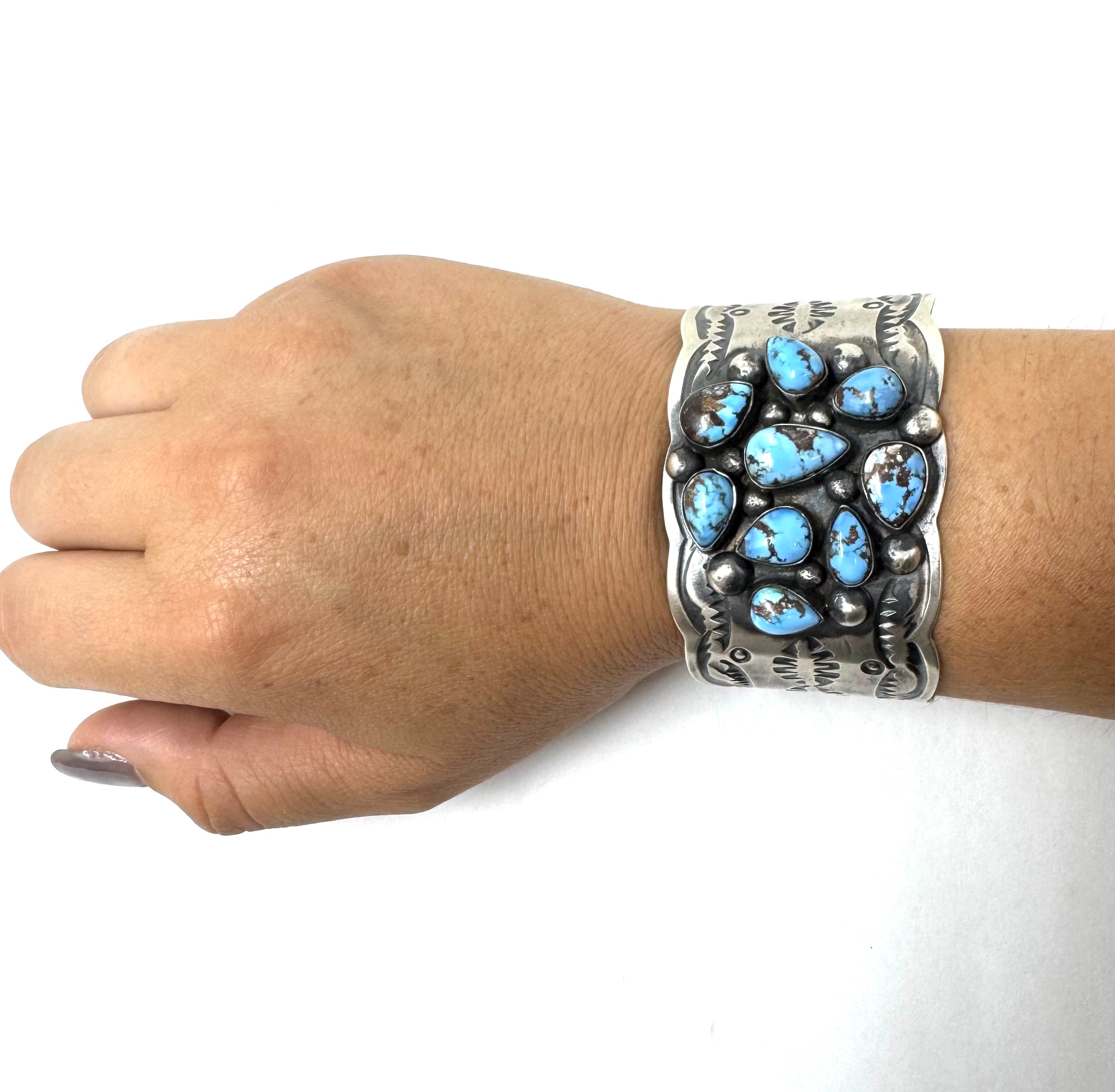The wide sterling-silver band features hand-stamped native motifs, creating a powerful blend of tradition, artistry, and contemporary style. The weight and presence of this cuff make it a centerpiece—perfect for collectors, turquoise lovers, and anyone who wants to wear authentic Native craftsmanship with confidence.